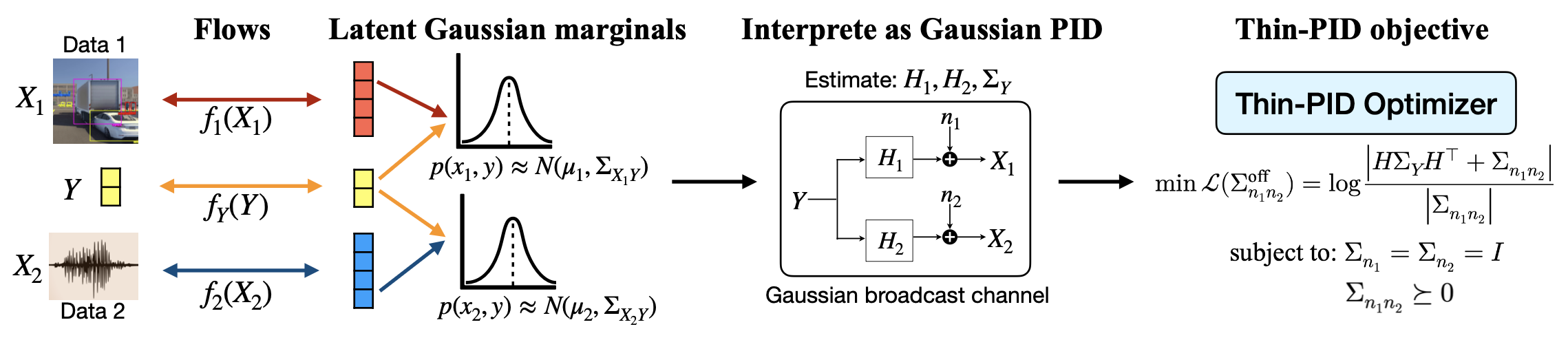 learn flows → obtain approximately Gaussian pairwise marginals in latent space → run Thin-PID to compute PID.