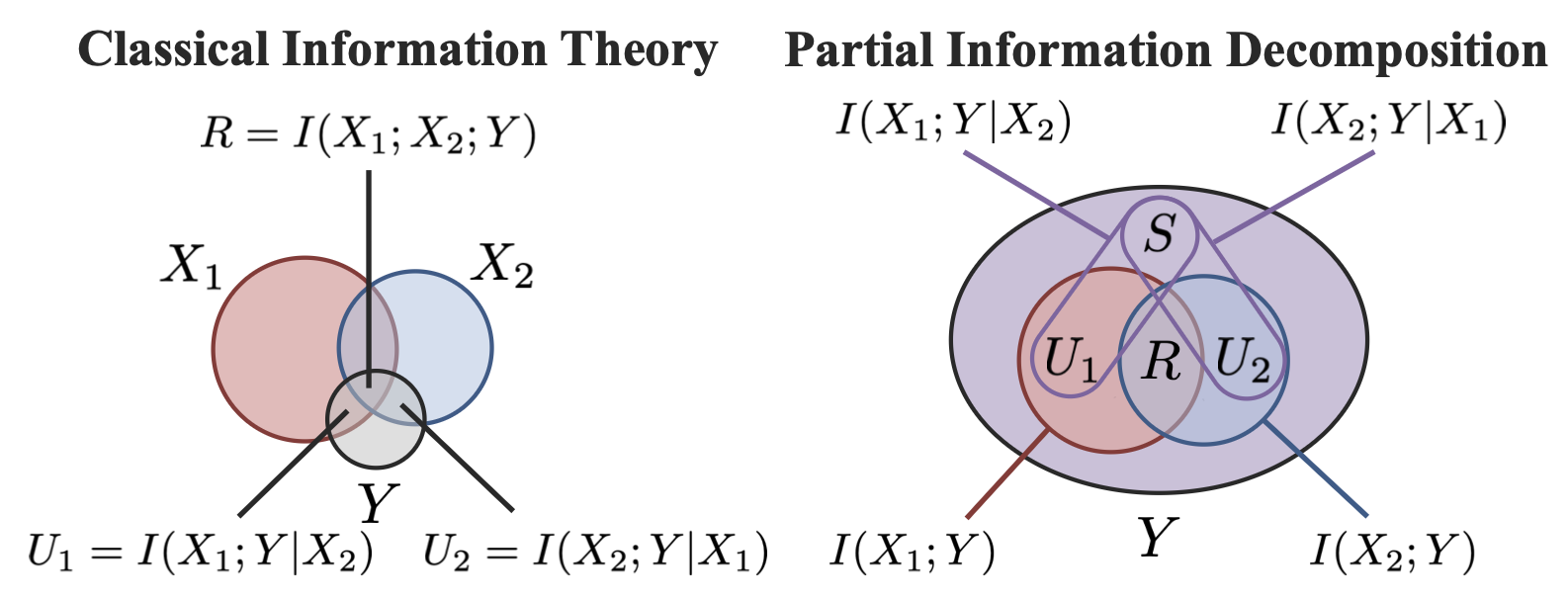 Partial Information Decomposition (PID) is an information-theoretic tool that formalizes this story by decomposing the total mutual information (I(X_1, X_2; Y)) into four nonnegative parts: