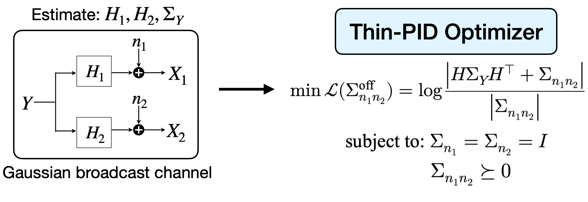 A broadcast-channel view: We reparameterize the Gaussian setting as a broadcast channel. [ X_1 = H_1 Y + n_1, \qquad X_2 = H_2 Y + n_2. ] After whitening, the remaining freedom lives largely in the cross-covariance between noises. The synergy computation becomes a clean log-determinant optimization with a PSD constraint, which we solve via projected gradient descent with stable SVD-based projections.
